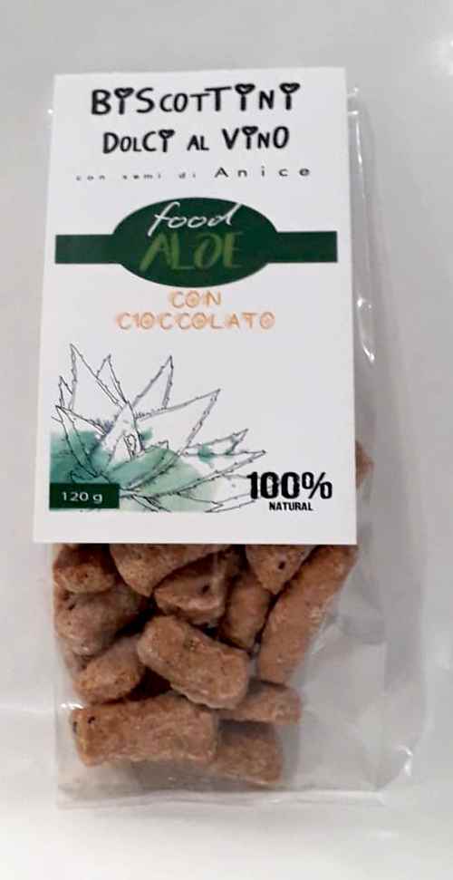 Ingredienti: semola di grano duro, Vino, Vino Bianco, Olio di semi di girasole,Zucchero, Aloe vera, semi di Anice 5%, Cioccolato Fondente 10%