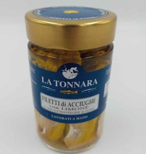 Filetti di Acciughe c/limone in Olio Extravergine di Oliva, lavorato a mano.Ingredienti: Acciughe, Olio Extravergine di Oliva,