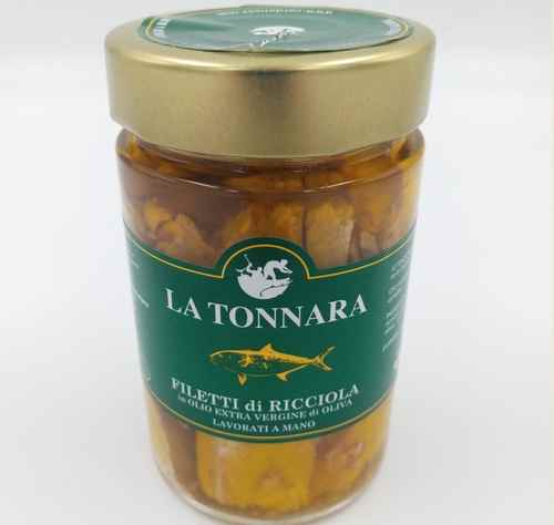 Filetti di Ricciola in Olio Extravergine di Oliva, lavorato a mano.Ingredienti: Ricciola 65% Olio Extravergine di Oliva 33% Sale 2%