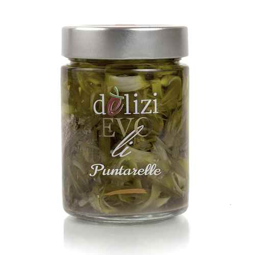 Le Puntarelle Sottolio delle racchiudono tutto il sapore del tempo, sapientemente conservato secondo la tradizione culinaria pugliese, in modo da esaltarne il gusto. Le Puntarelle Sottolio sono una tipica preparazione delle cime delle cicorie, ovvero i germogli che si formano nella parte interna del cespo della cicoria, leggermente sbollentate in acqua e aceto, per essere poi condite con olio extravergine di oliva, aceto, sale e peperoncino. Una preparazione dal gusto unico e irresistibile, immancabile sulle rustiche tavole del sud. Le Puntarelle Sottolio sono ottime accompagnate con crostini di pane tostato e un tagliere di salumi.